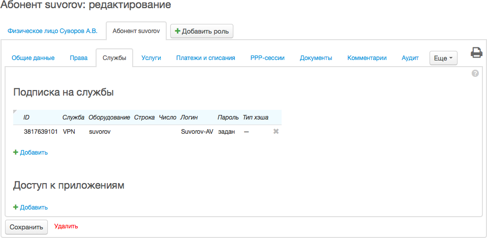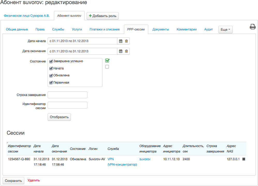4. Информация о обновлённой сессии в приложении «Офис оператора связи» на вкладке «PPP–сессии» формы редактирования абонента: