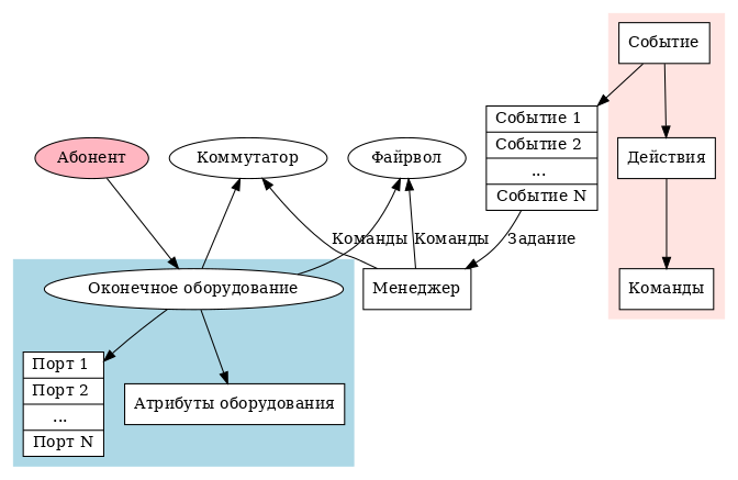 - Менеджер выполняет команды на оборудовании (файрвол, коммутатор).